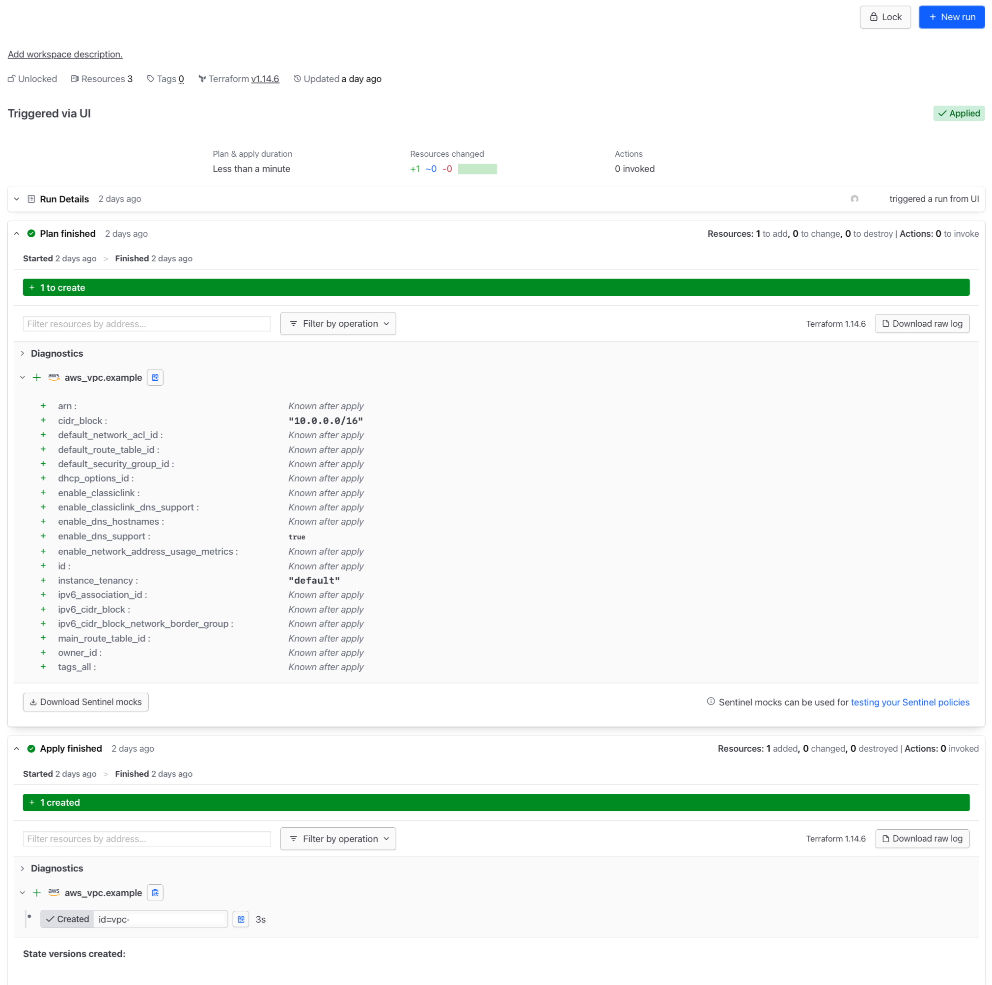 これで設定完了です。初回のデプロイはワークスペースのRuns > New Run から実行できます。通常のTerraformと同じく、Plan結果が問題なければApplyを押下します。